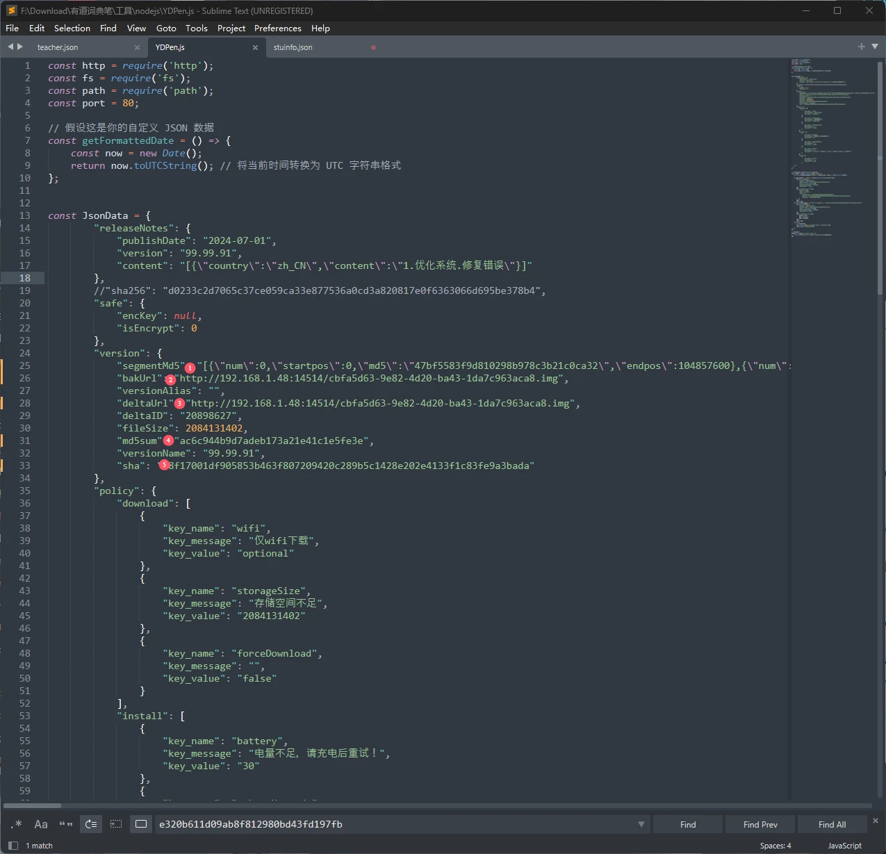 首先自行安装nodejs 然后编辑YDPen.js,将”JsonData”的内容全部替换为前面抓包抓到的内容,然后手动修改’segmentMd5’中每一个分块的md5值为前面计算得到的md5值,并修改bakUrl和deltaUrl为”http://{本机局域网ip}:14514/你修改的完整包.img”,随后修改’md5sum’为前面计算的完整img的md5,sha修改为计算的sha256值
