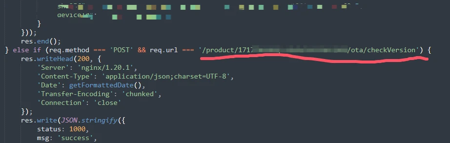 下拉到js下方部分,修改’/product/1717746496/*********/ota/checkVersion’为你自己抓到的请求url,保存文件。